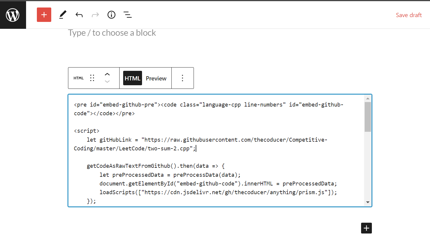 The language-* class name added to the code tag should be suffixed with an appropriate name of the programming language that matches your code file. In my case, I’ve used a raw URL for a C++ code file so I’ve added the language-cpp class to my code tag.